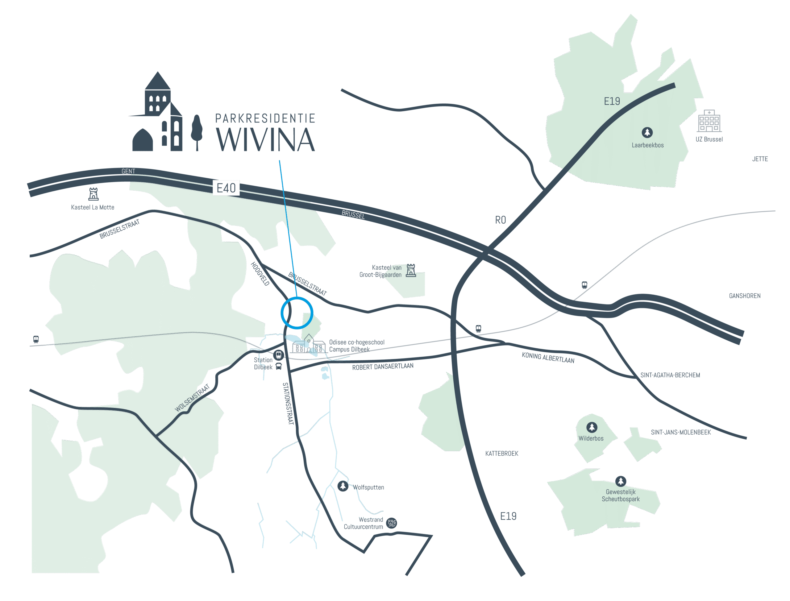De residentie is gelegen in Dilbeek, in een parkdomein met meer dan 10 hectare abdijtuin met zitbanken, bloemenvelden, moestuintjes, een beeldenpark, een vijver en neerhofdieren. Wonen in residentie Wivina betekent dat u thuiskomt in een oase van rust, en dat op een boogscheut van het centrum van de stad met al z’n faciliteiten.